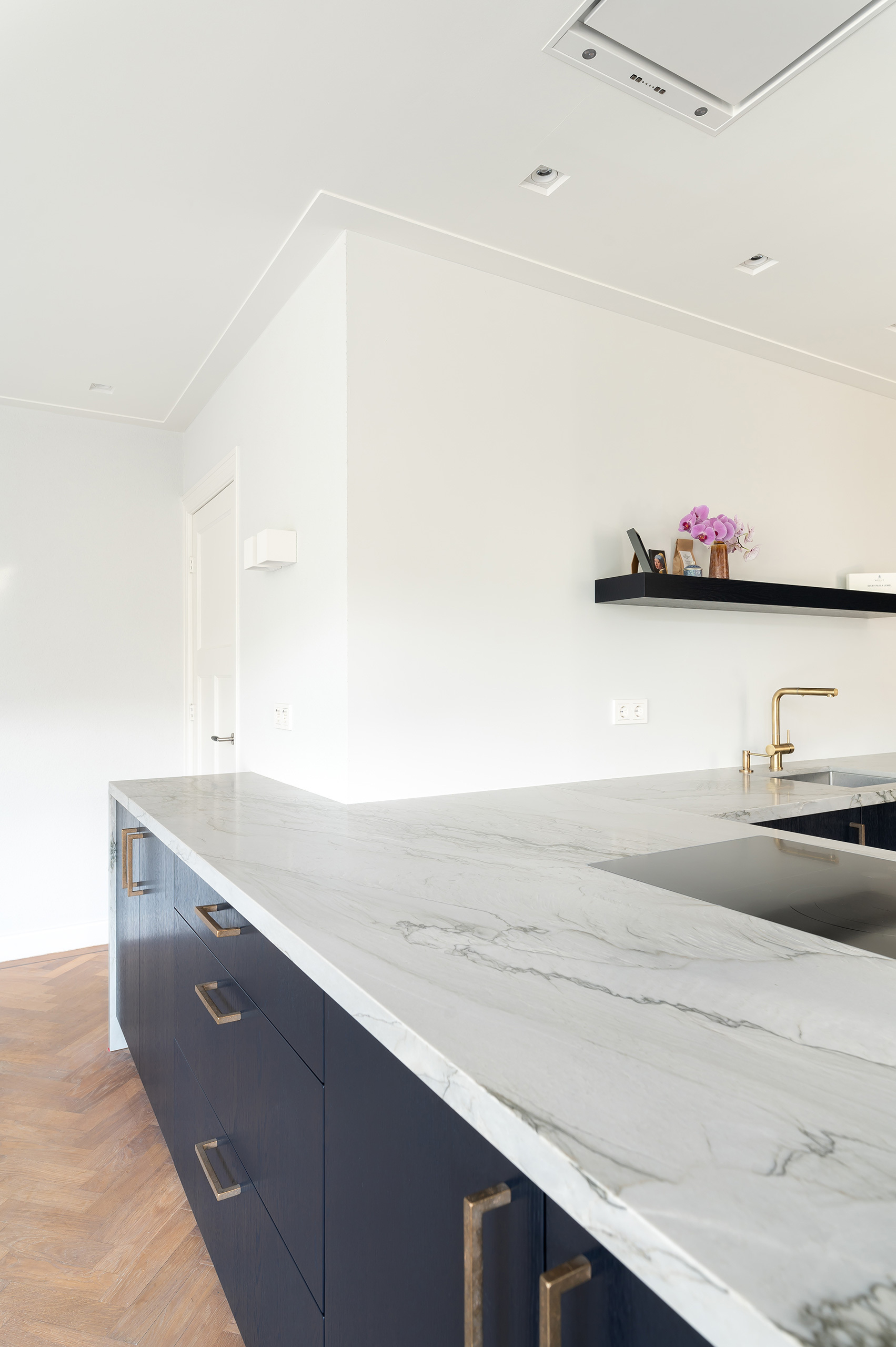 In Baarn hebben wij deze hoekkeuken geplaatst. Het kwartsiet werkblad van deze keuken loopt door in verstek tot op de grond. De keuken bevat een vlakinbouwe kookplaat met een plafondafzuiging die op afstand te bedienen is. De eiken fineer fronten en zichtwanden zijn gespoten in een donkerblauwe kleur. De hoek van de keuken is voorzien van schappen in kleur gespoten. De ovens zijn boven elkaar geplaatst.