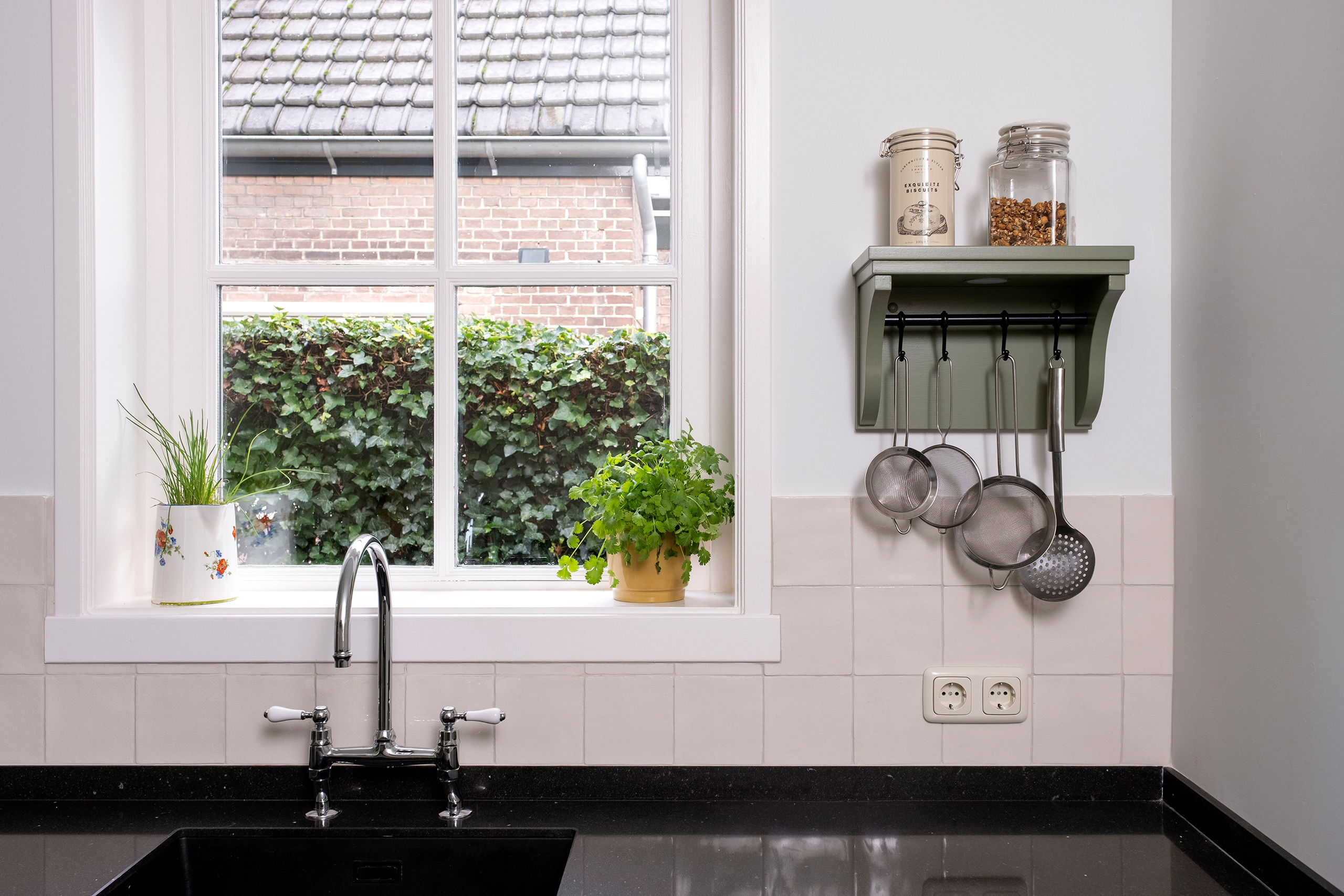 In Apeldoorn hebben wij deze landelijke hoekkeuken geplaatst. De keuken is geschilderd in een olijfgroene kleur. Met een mooie oplossing voor een buitenhoek. De schouw, tegeltjes, vloer en de wandschappen geven deze keuken net dat beetje extra stijl. De ruimte was niet heel groot, maar door deze indeling oogt hij nog ruim en is er toch behoorlijk wat kastruimte.