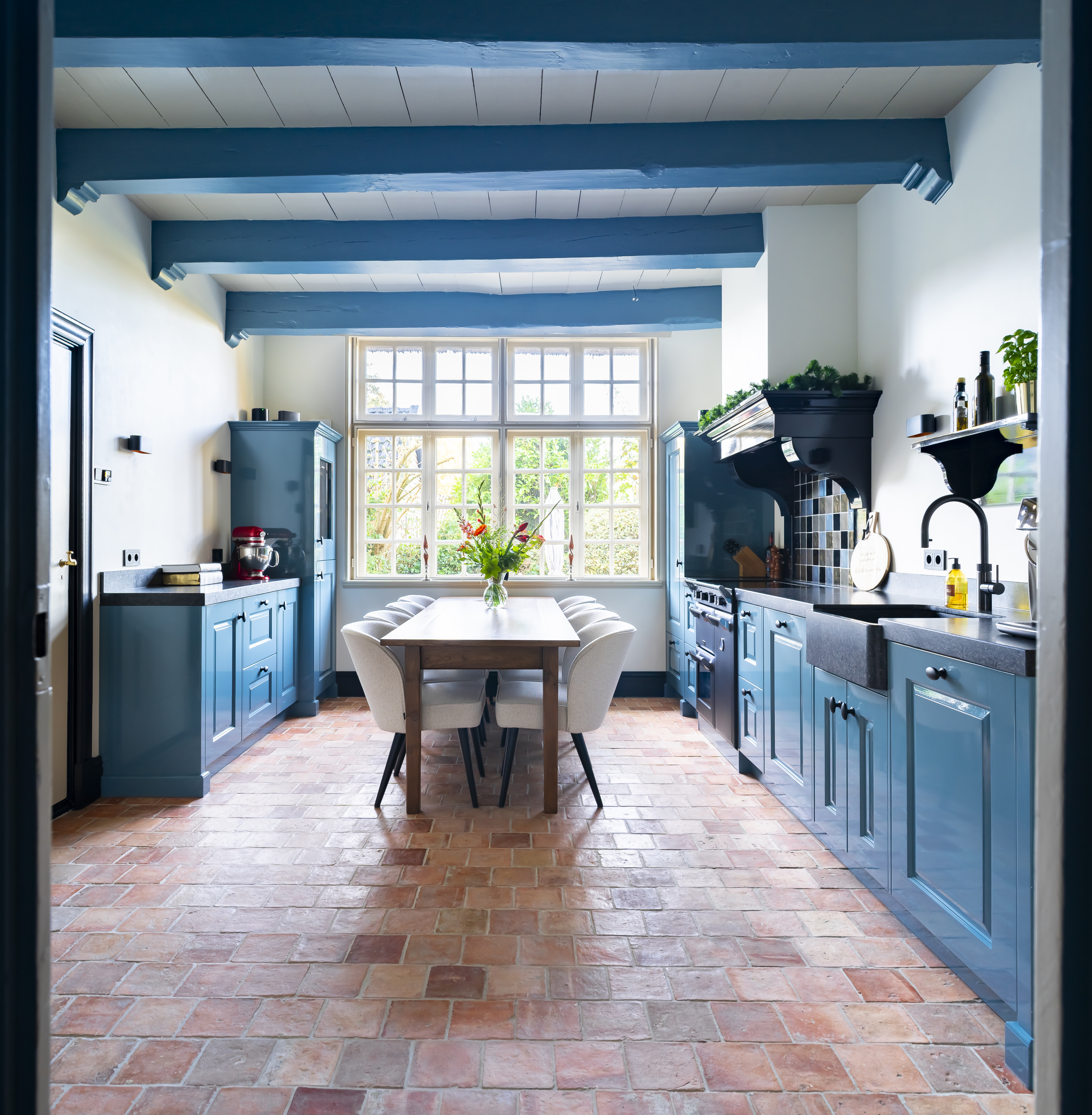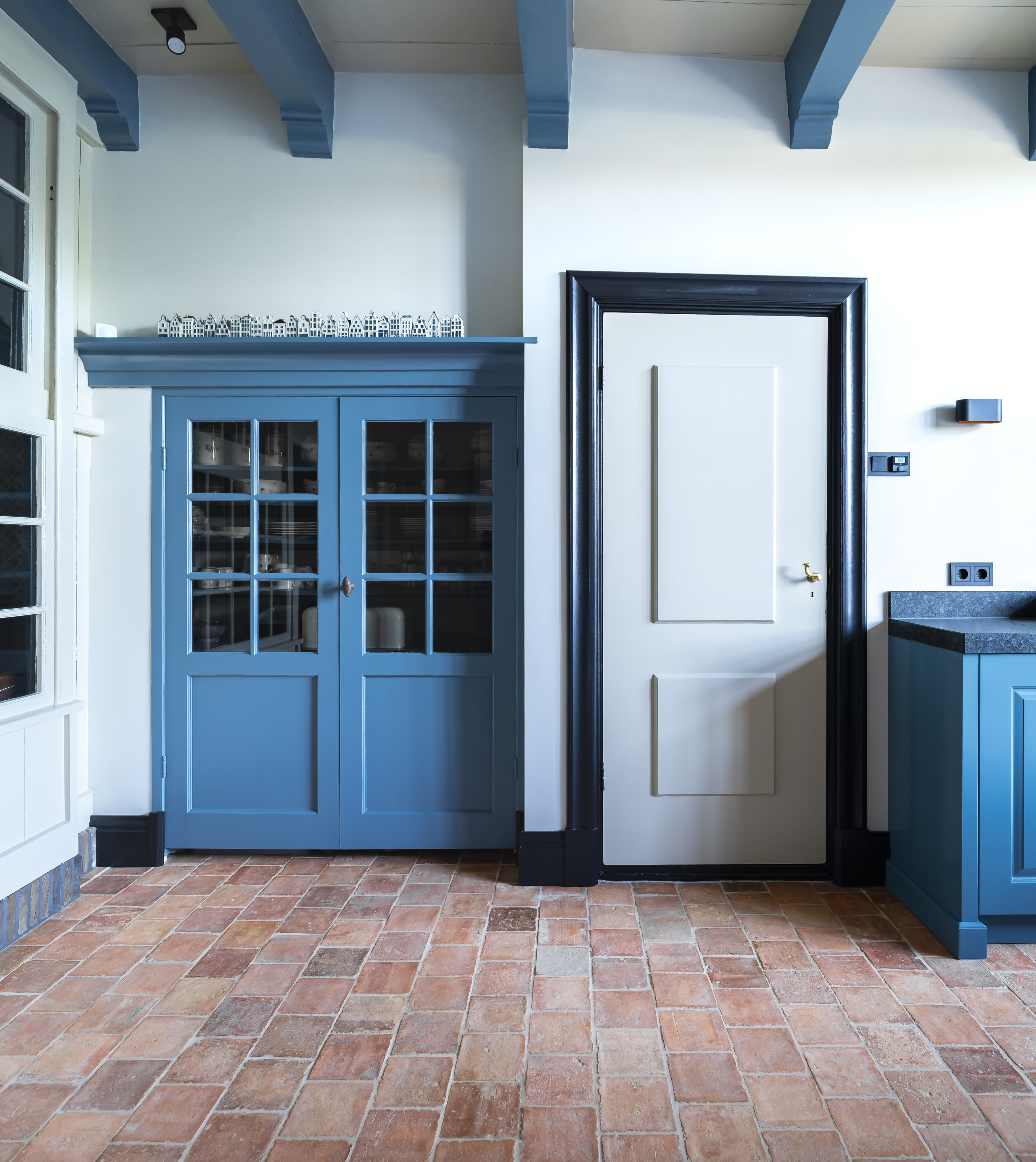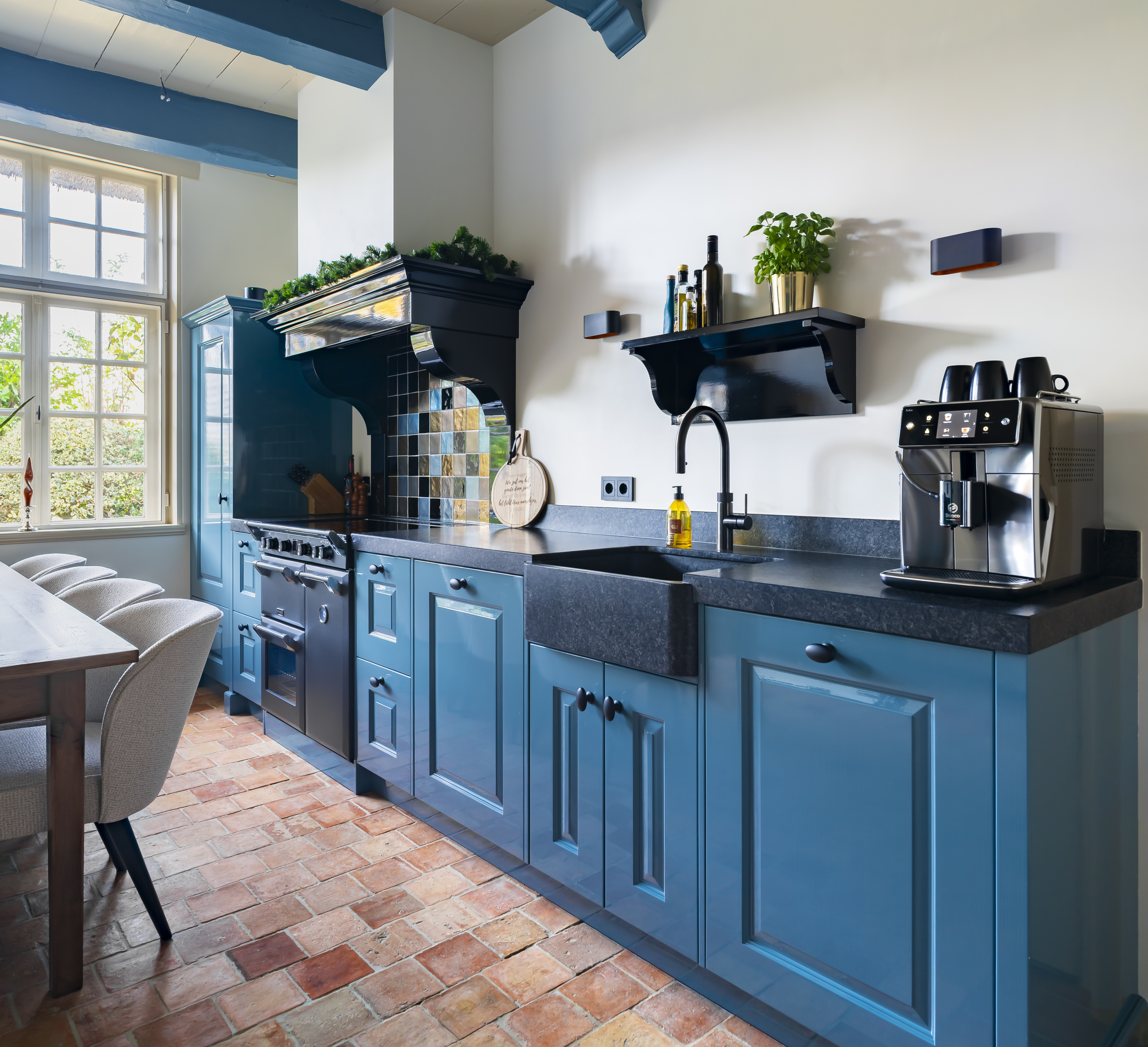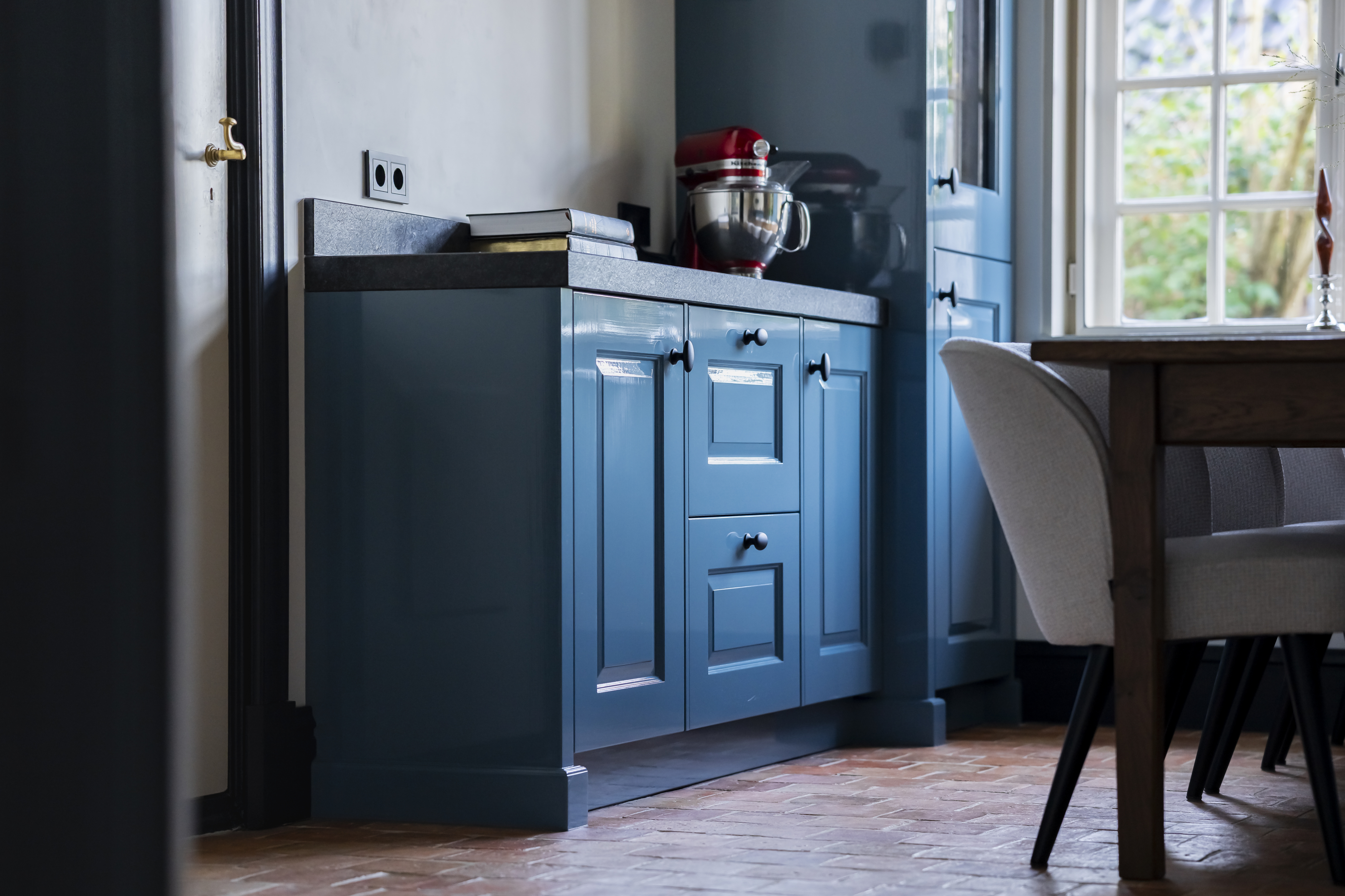 Deze keuken is gerealiseerd in een monumentale boerderijwoning en kenmerkt zich door klassieke details in de plinten en kroonlijsten. De kaderfronten zijn gespoten in Little Greene 326 Etruria, hoogglans en afgewerkt met een kwaststreep. Ook de plafondbalken en de servieskast zijn uitgevoerd in dezelfde kleur voor een warm geheel.