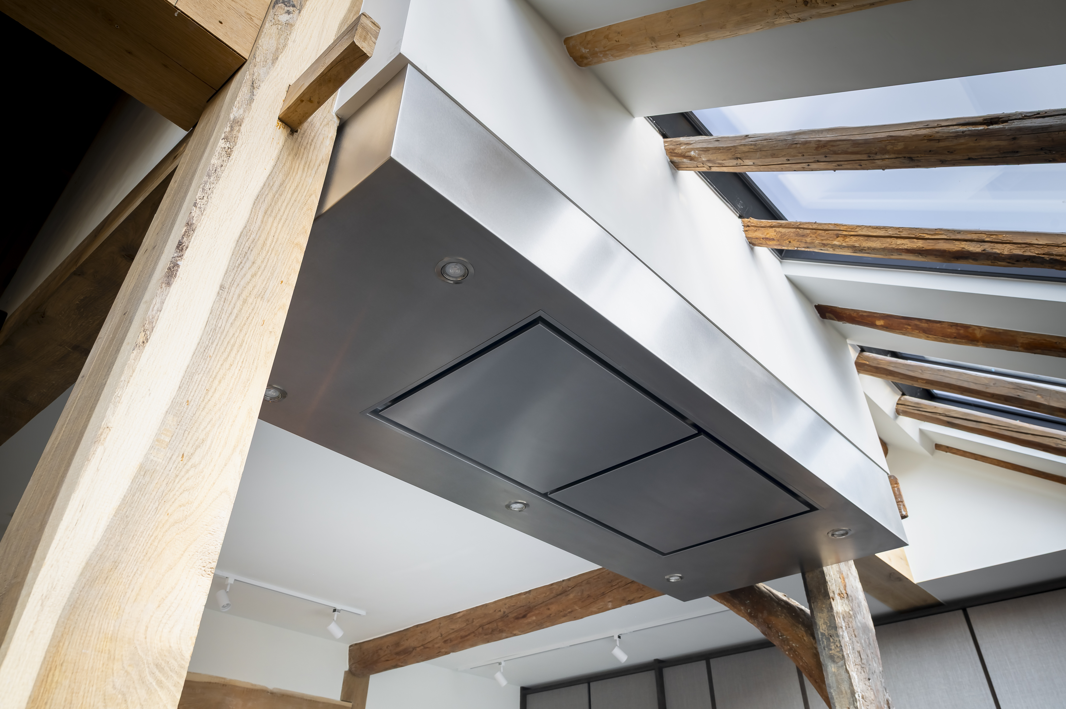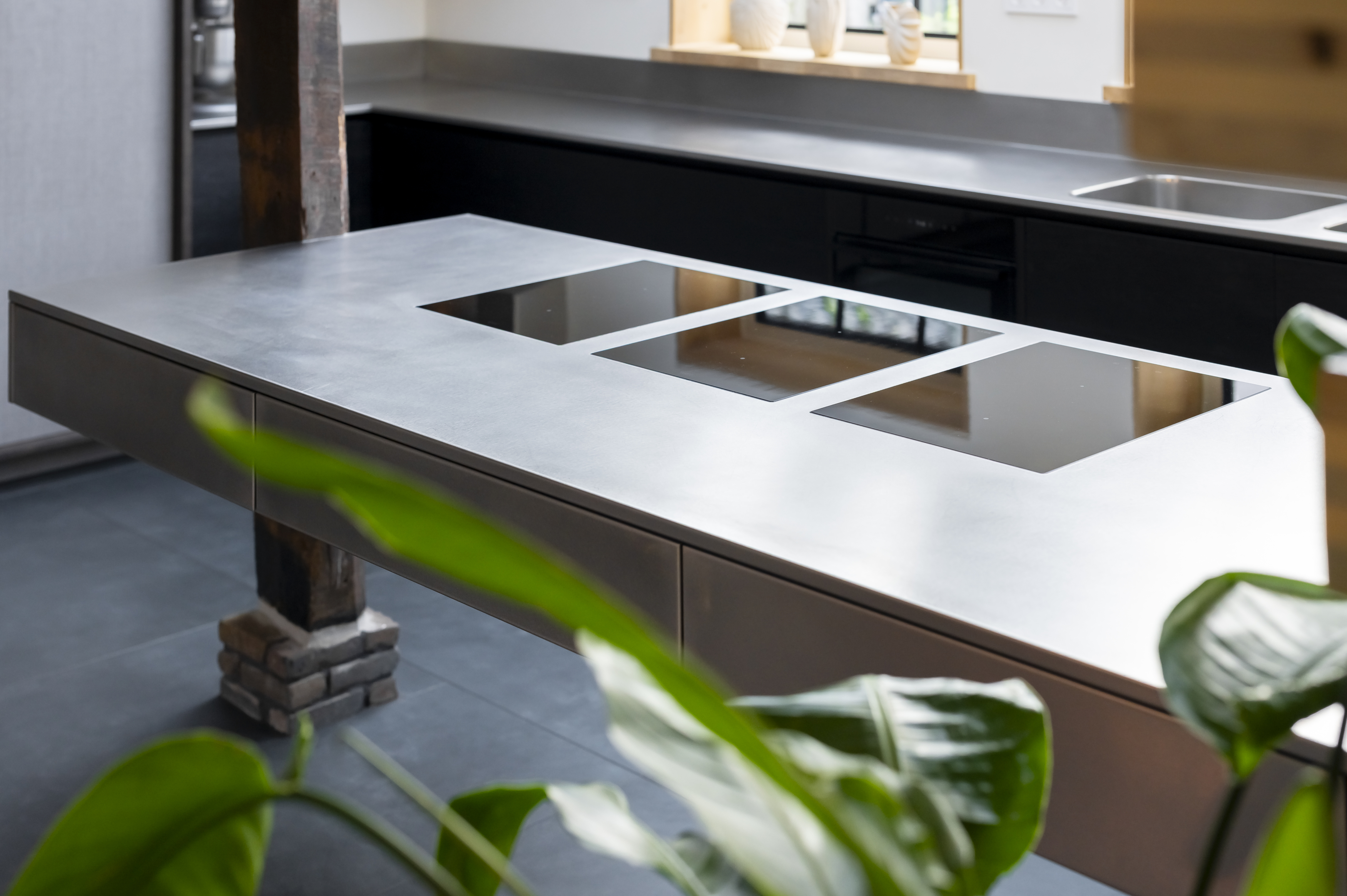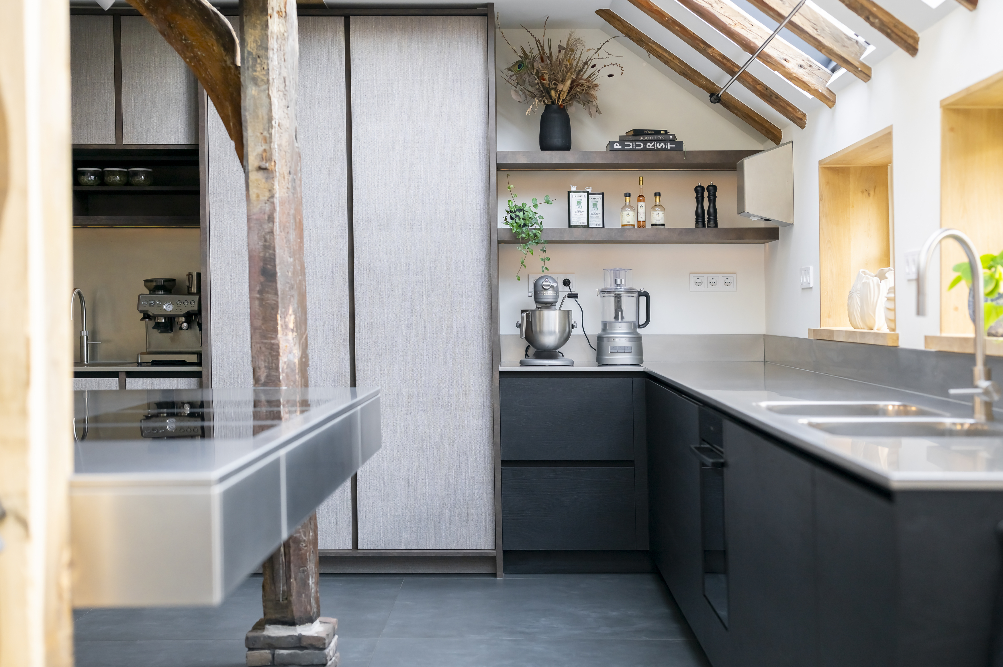 Deze semi-horecakeuken combineert een uniek design met een functioneel ontwerp. Het zwevende, greeploze eiland met geïntegreerde stopcontacten en drie domino kookplaten is geplaatst tussen twee steunpalen. Het werkblad, de afzuigkap en de extra diepe, dubbele spoelbak zijn uitgevoerd in RVS, wat zorgt voor een industriële uitstraling.