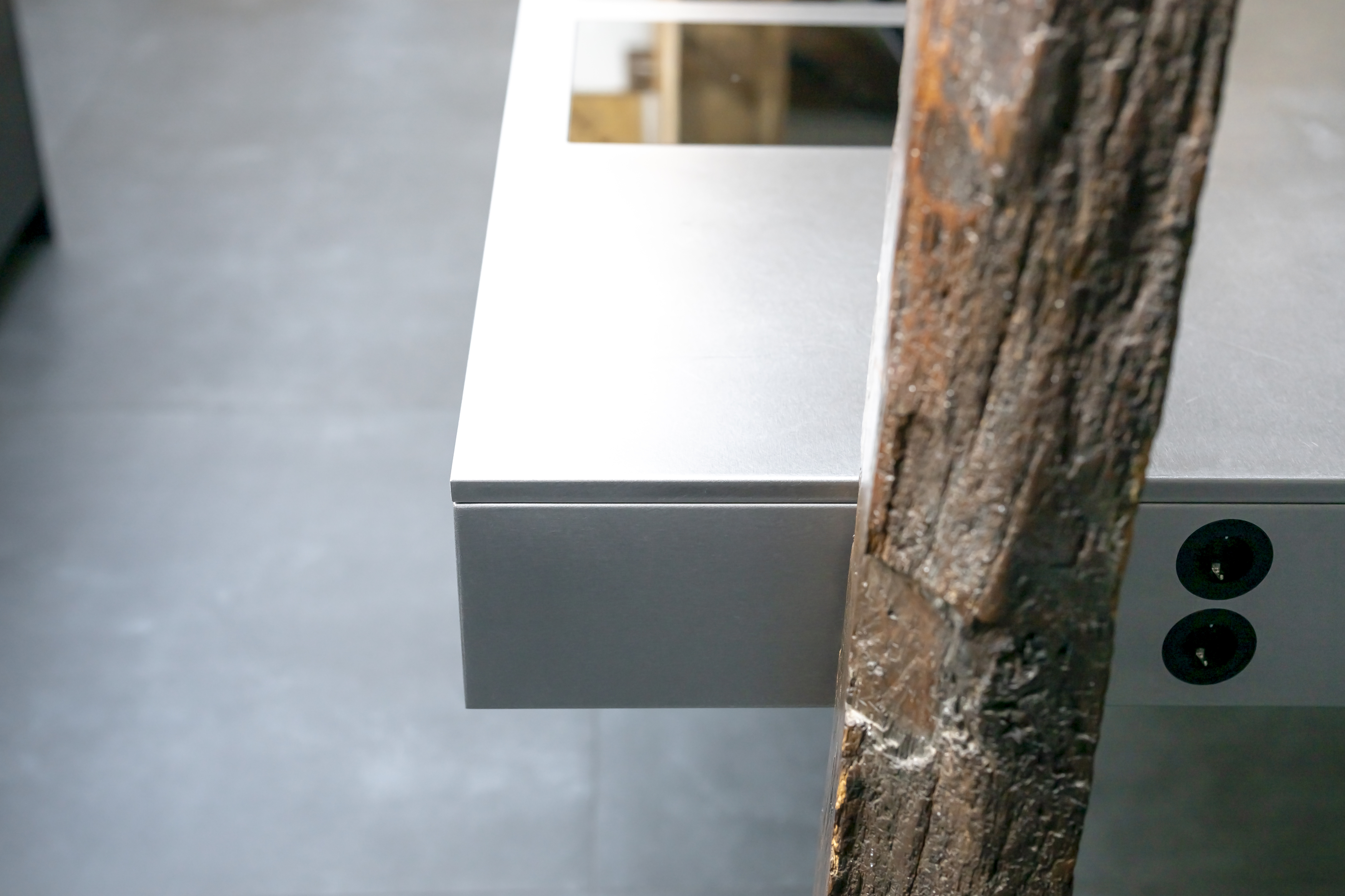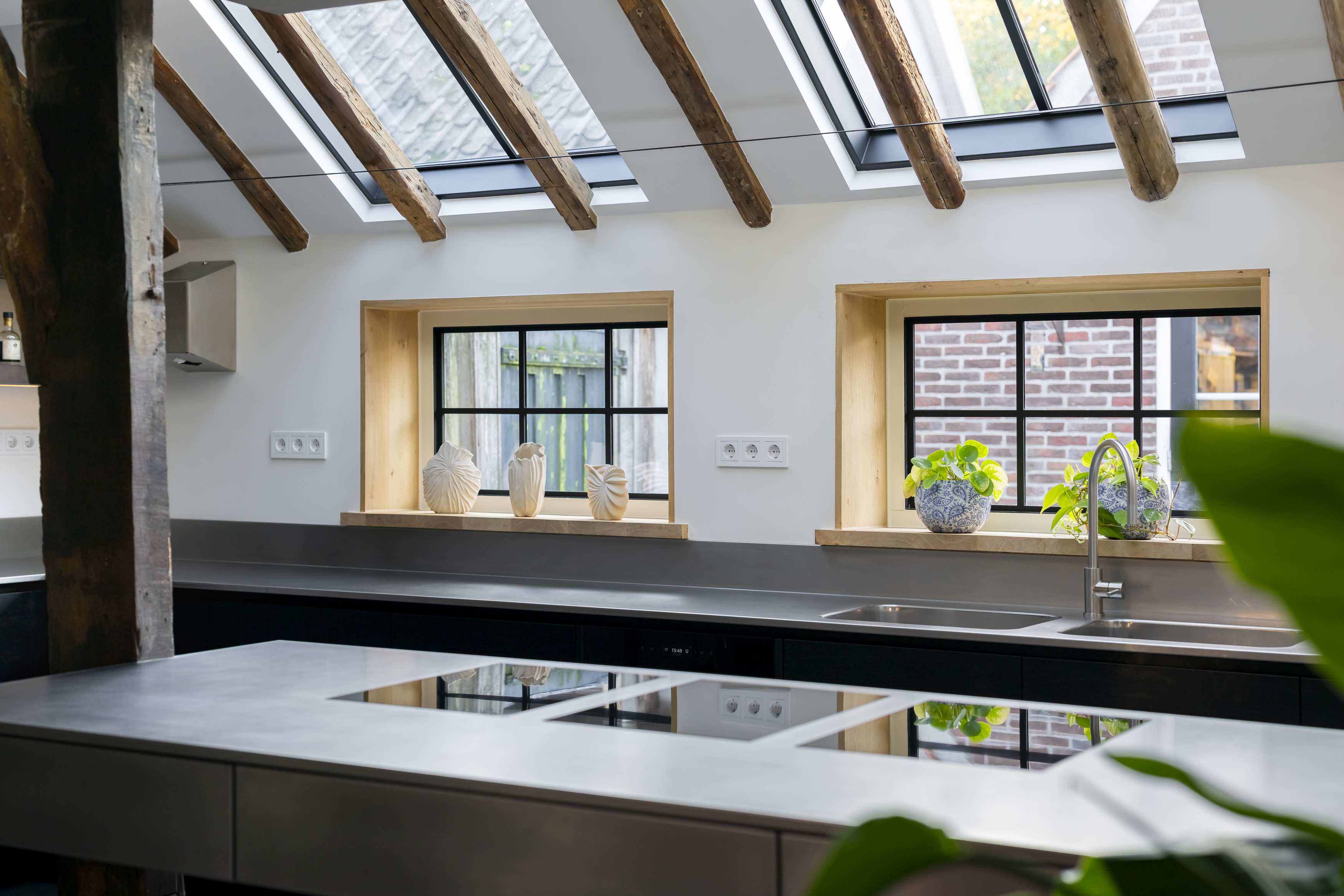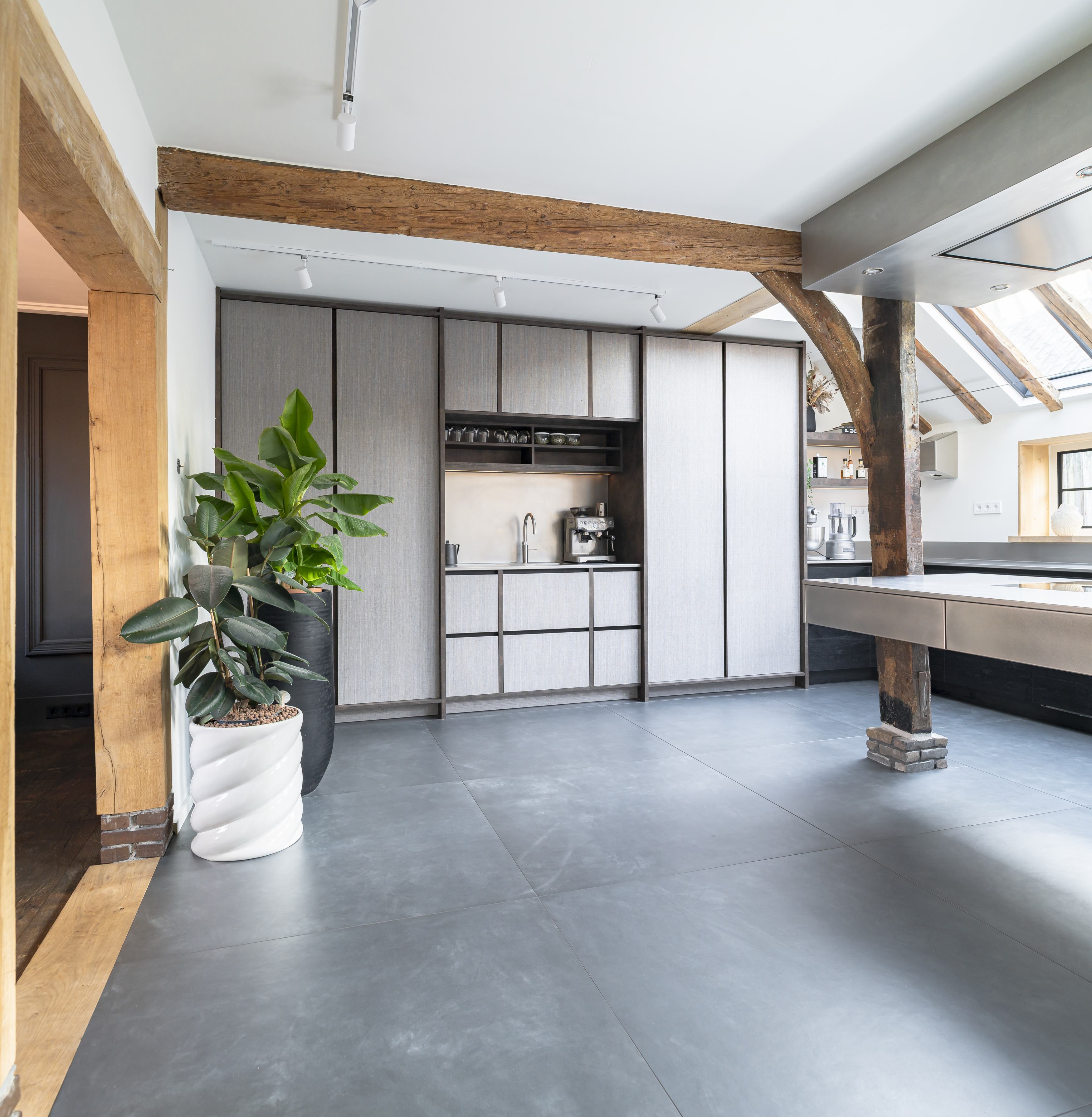 Deze semi-horecakeuken combineert een uniek design met een functioneel ontwerp. Het zwevende, greeploze eiland met geïntegreerde stopcontacten en drie domino kookplaten is geplaatst tussen twee steunpalen. Het werkblad, de afzuigkap en de extra diepe, dubbele spoelbak zijn uitgevoerd in RVS, wat zorgt voor een industriële uitstraling.