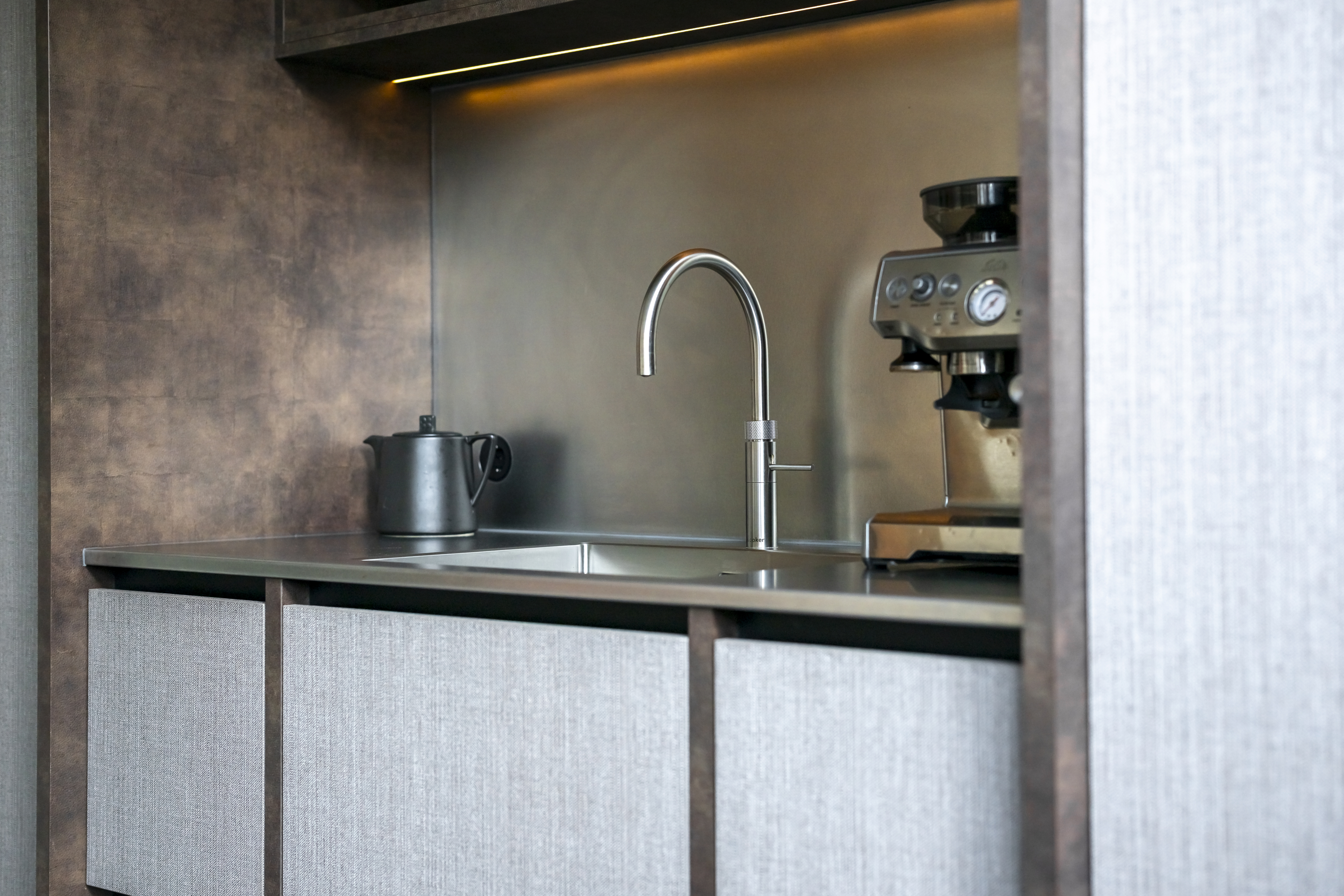 De fronten bij het spoelgedeelte hebben een doorlopende horizontale nerf. De hoge kastenwand is afgewerkt met stof- en leerstructuur en voorzien is van een koffienis met spoelbak.