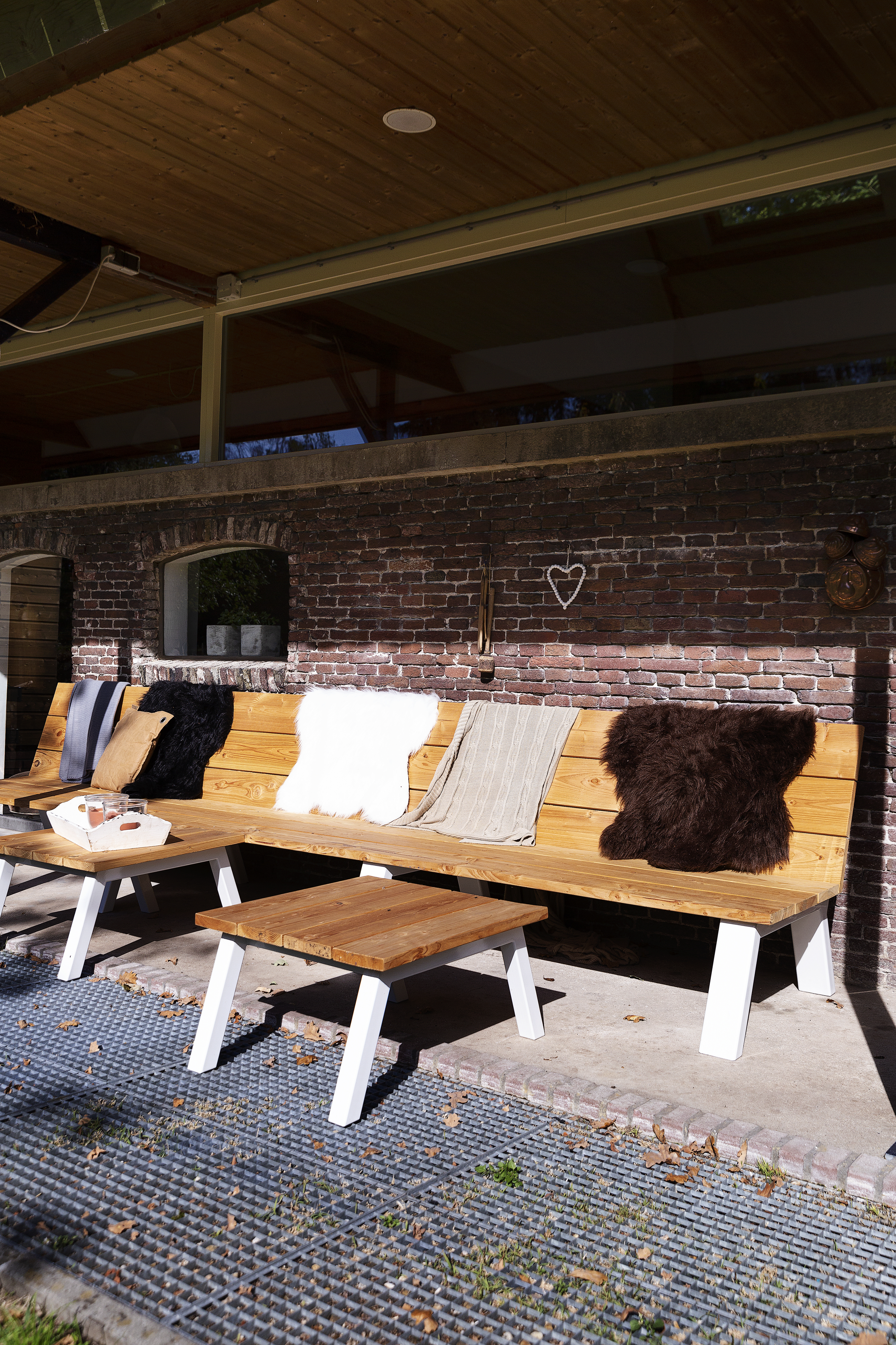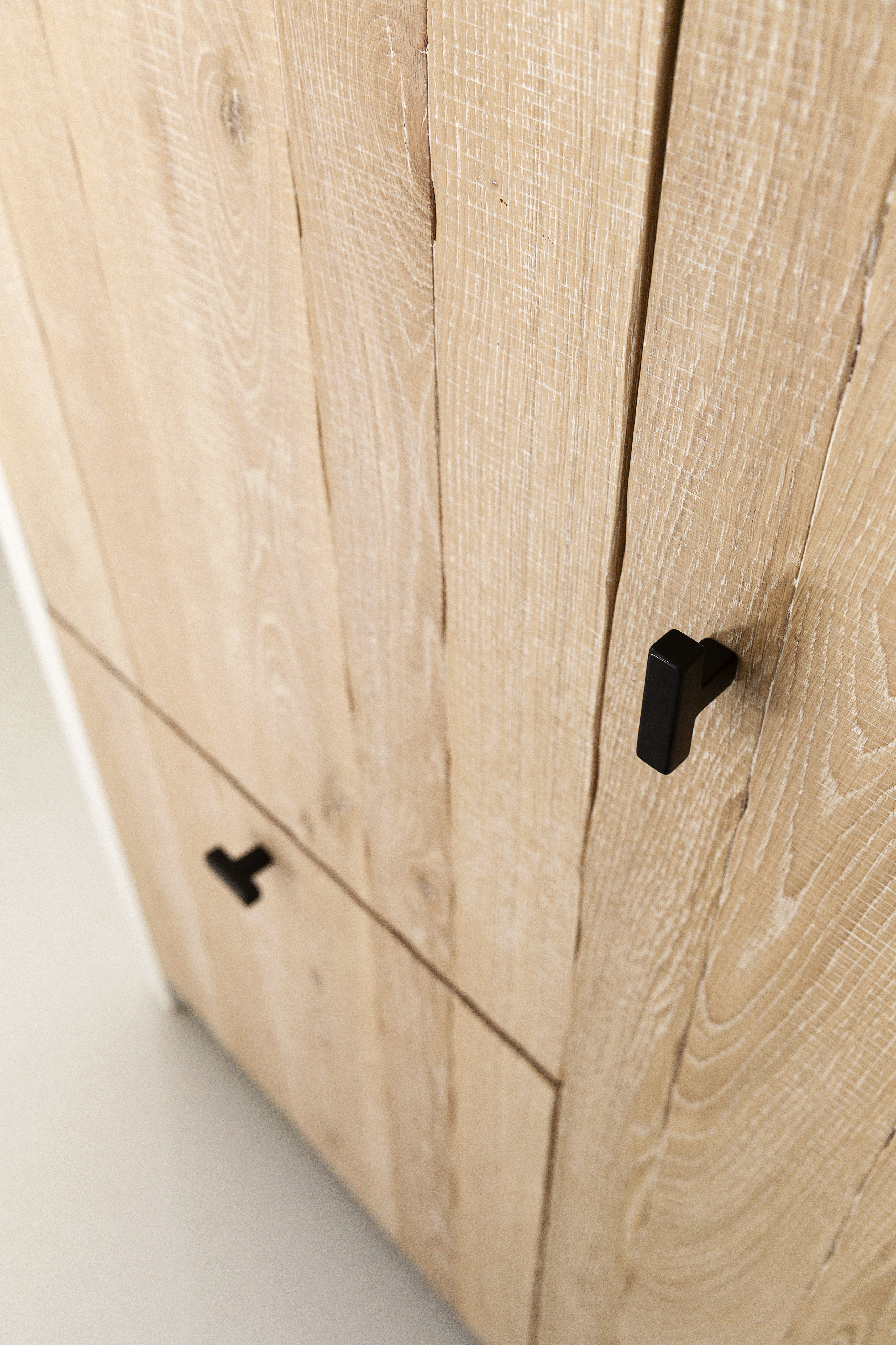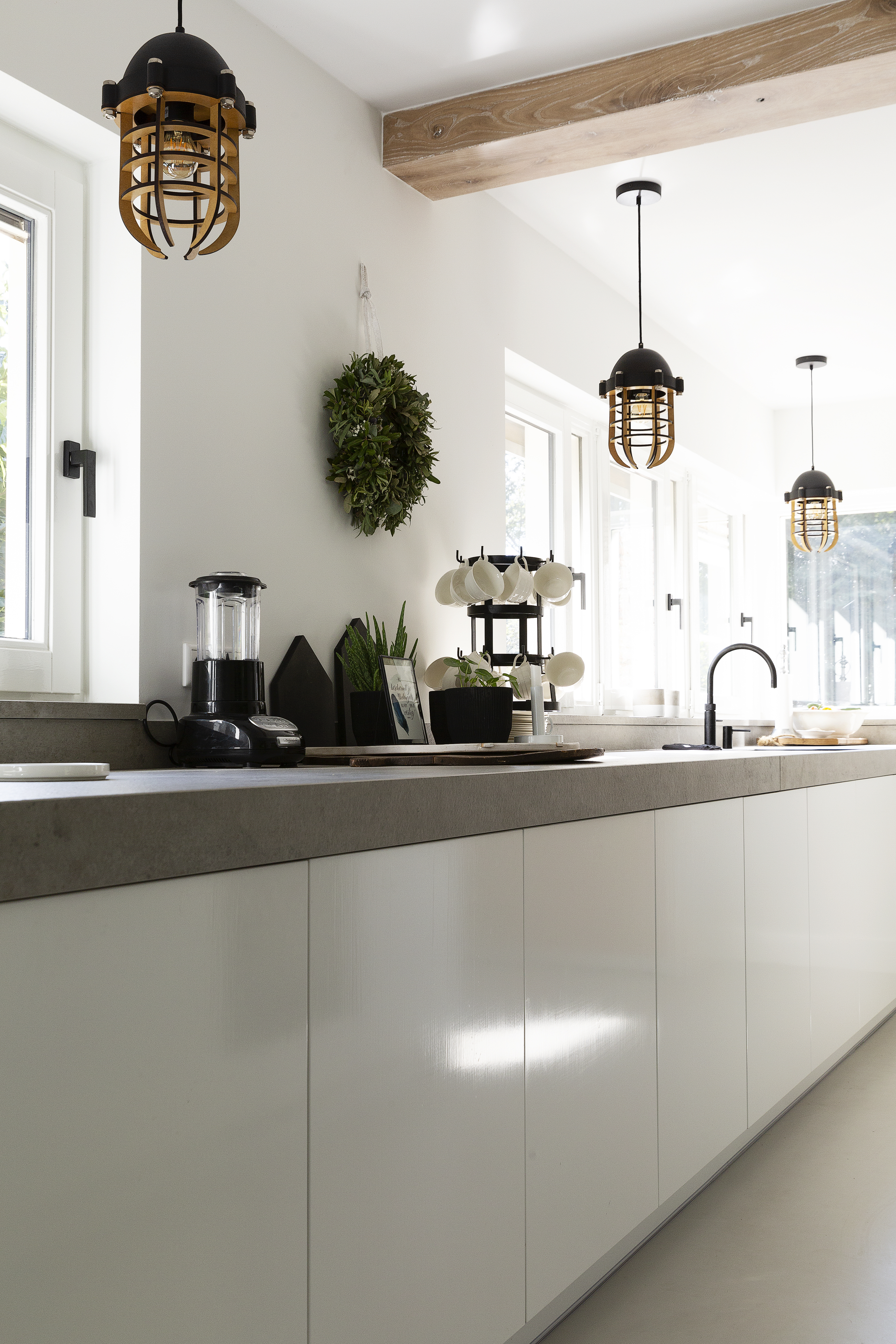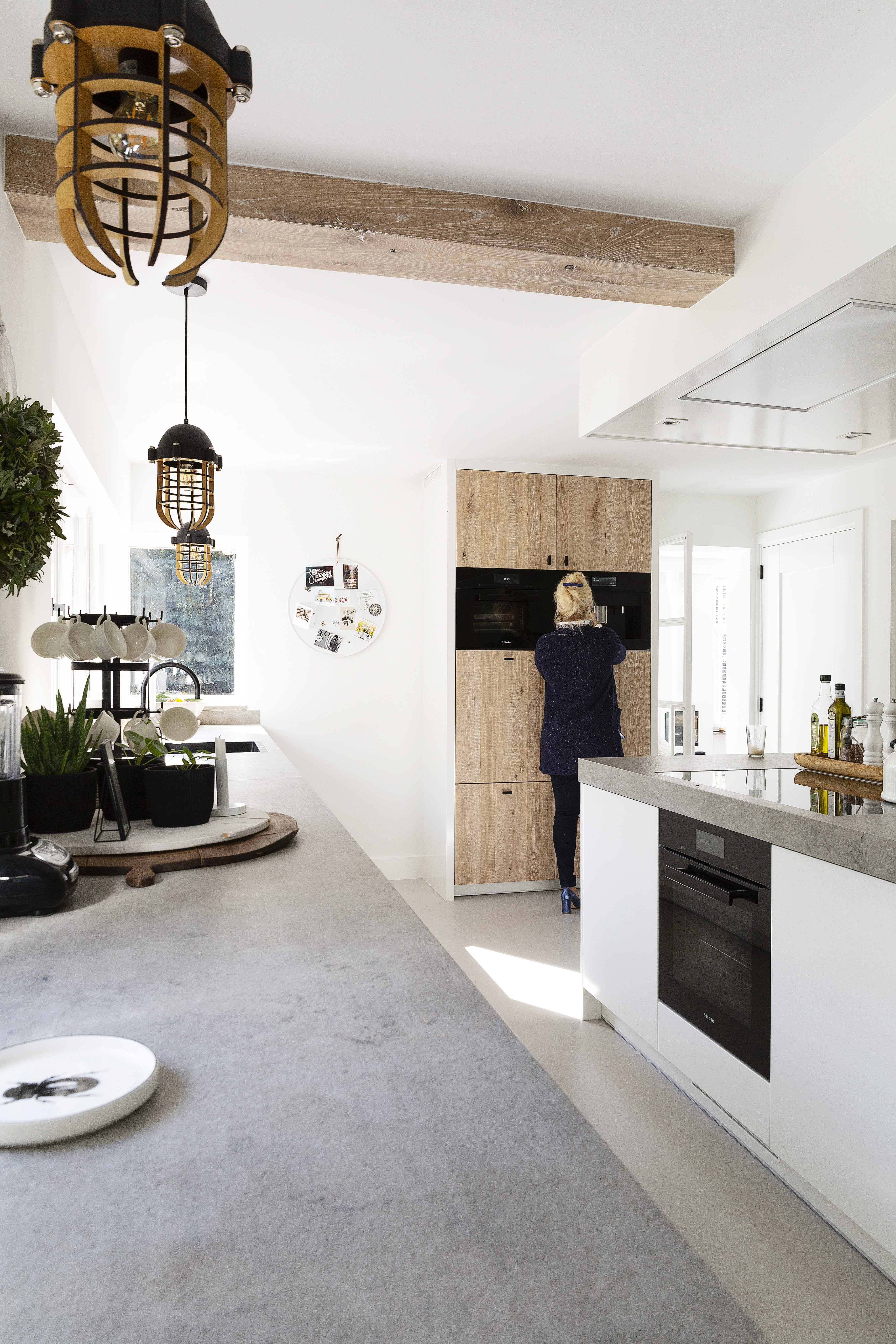 Deze moderne, lage keuken is geplaatst in Stoutenburg en is greeploos. De keuken bevat hoge kasten van massief eiken hout. Dit hout komt weer terug in de balk in het plafond.